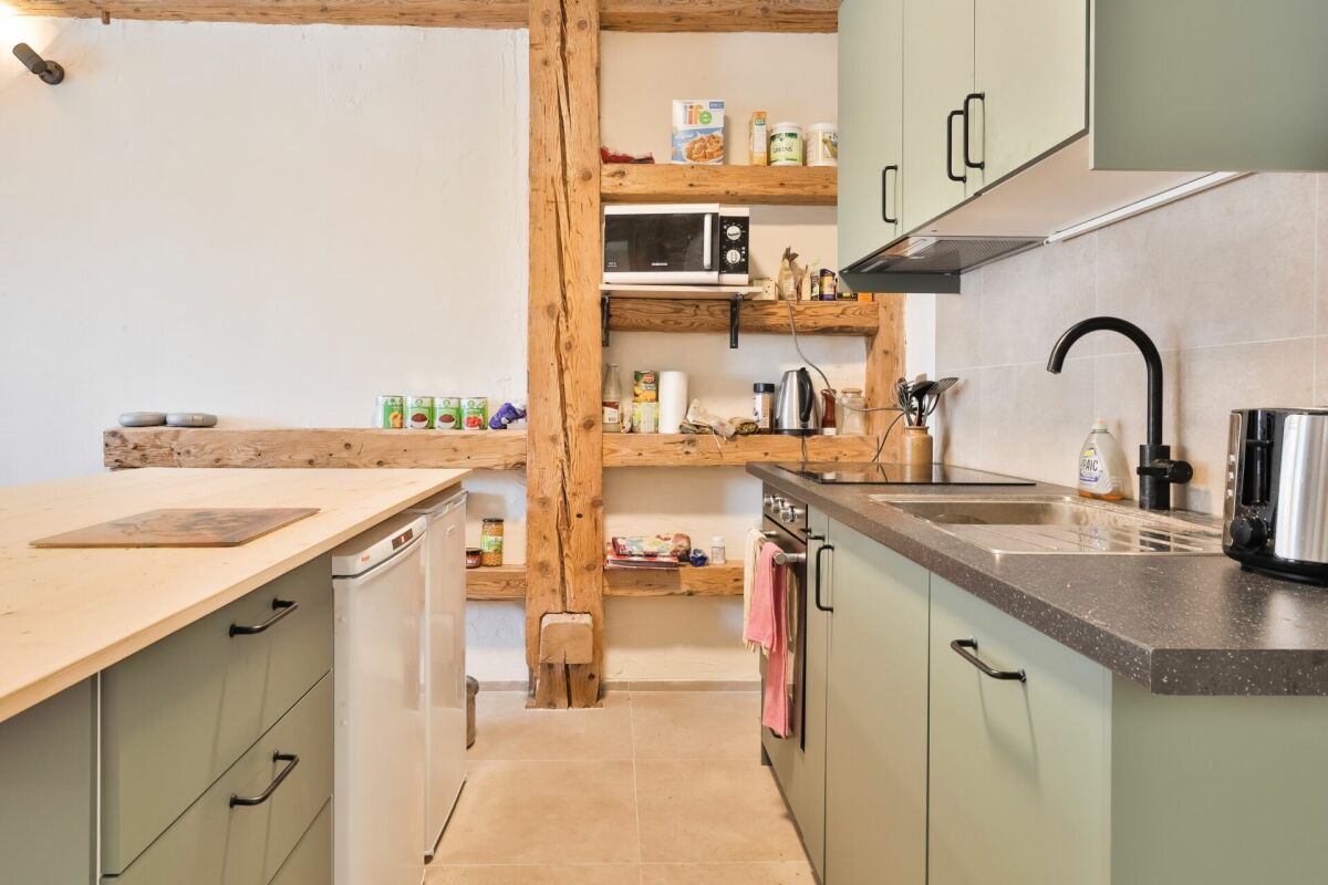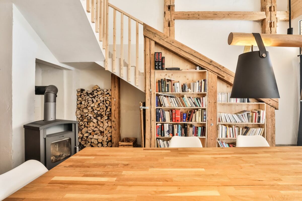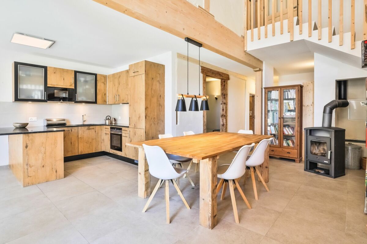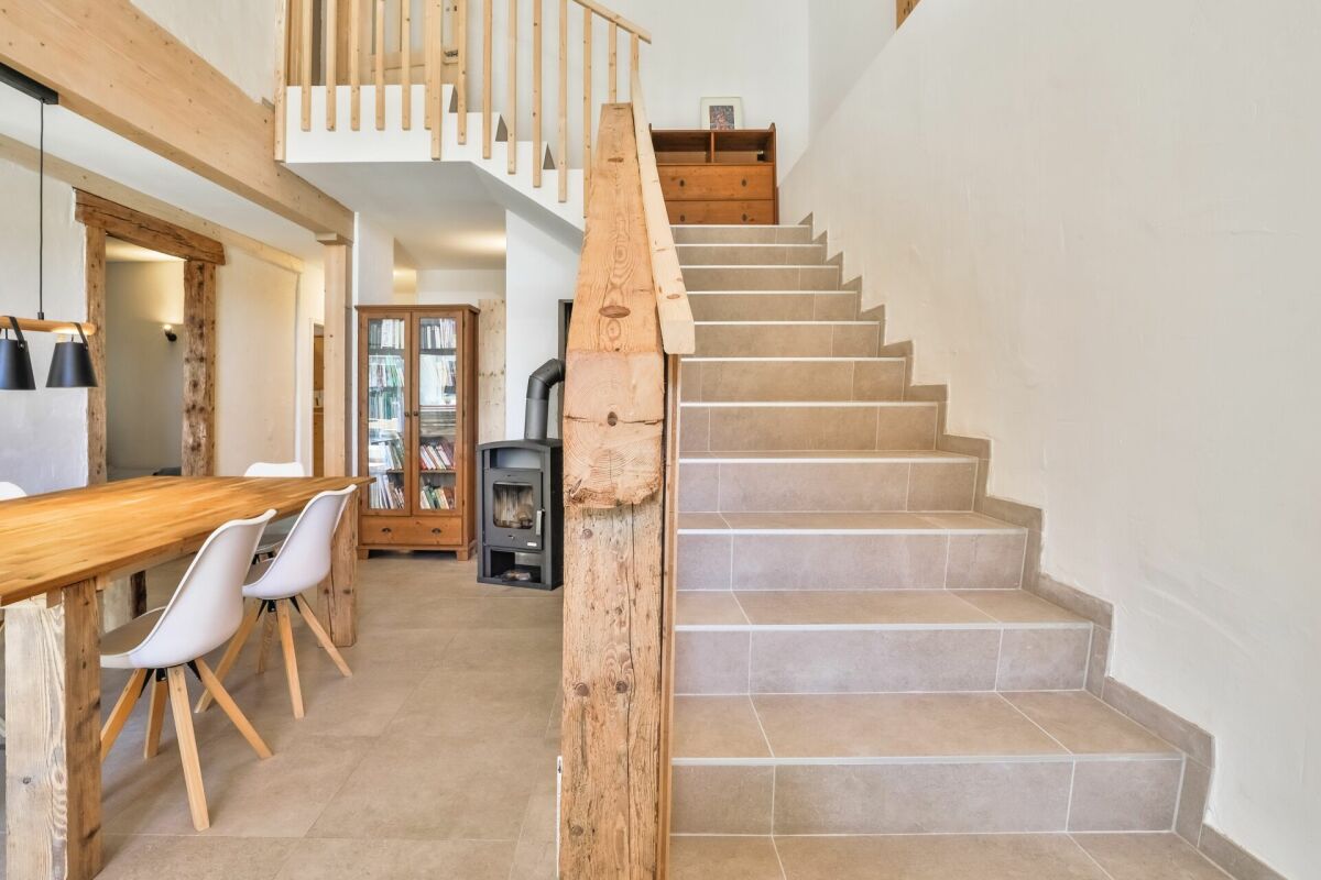 – On the ground floor, you’ll find a beautiful living area with a wood stove and an open kitchen that leads to a small terrace, as well as a bathroom and two bedrooms.
