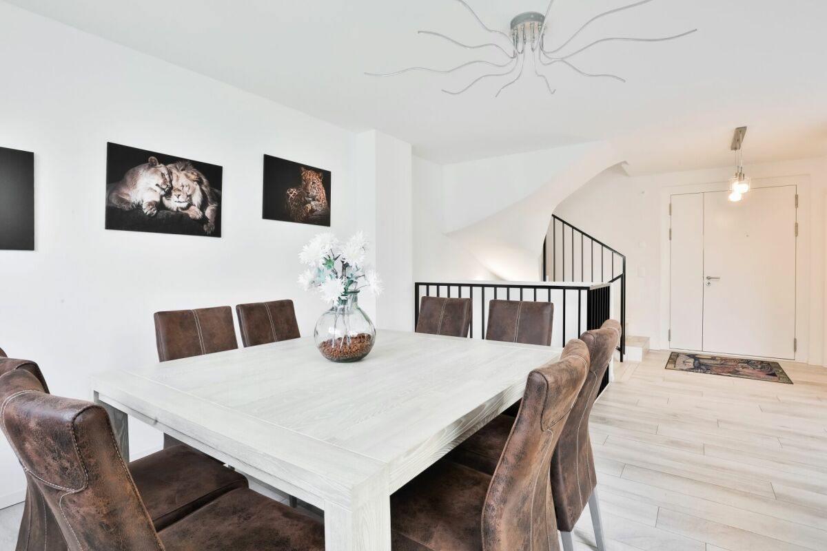 Outside, the contemporary architecture blends harmoniously into the calm residential surroundings.