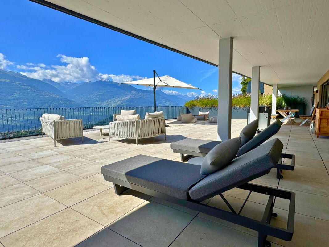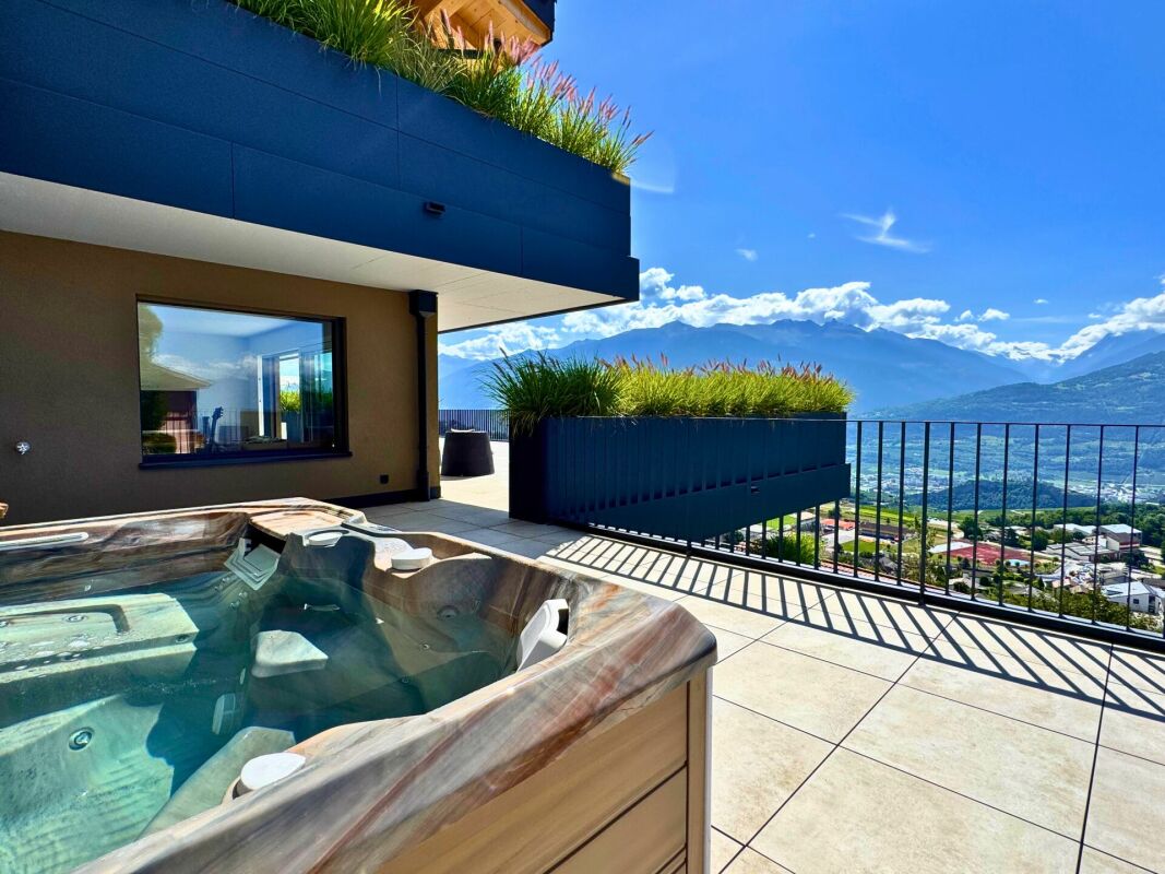 Chaque pièce s’ouvre sur l’une des deux terrasses panoramiques de 208 m² et 160 m², offrant une vue imprenable sur la vallée et les montagnes environnantes. Un jacuzzi privé complète ce cadre idyllique.