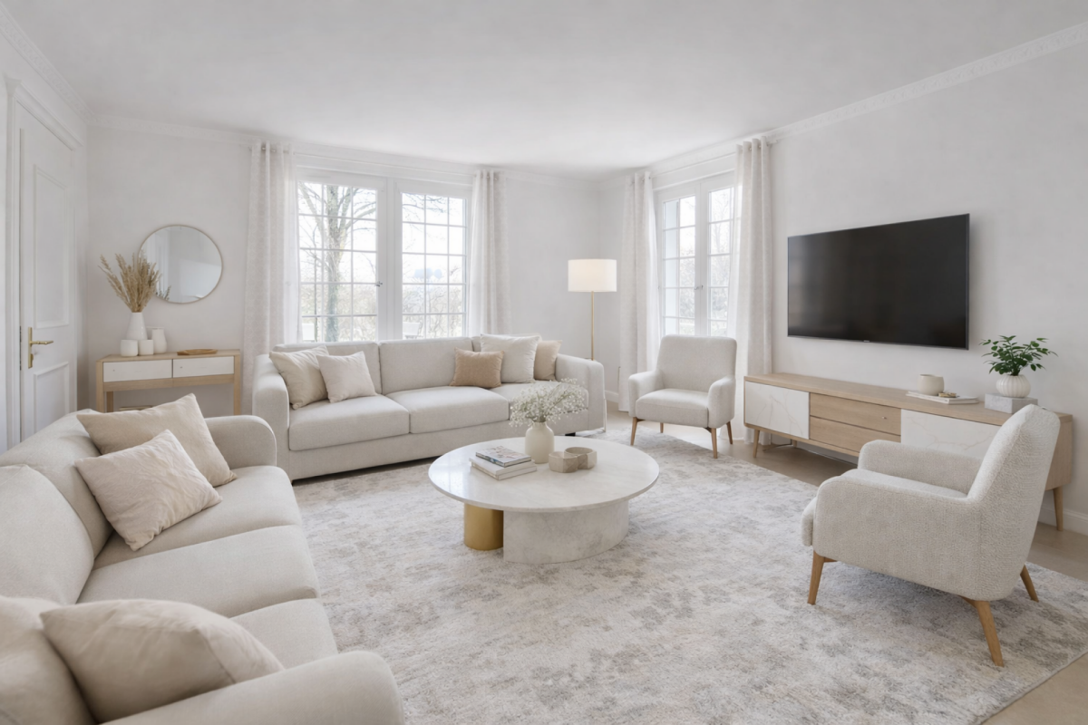 La villa principale, d’environ 350 m² habitables répartis sur trois niveaux, séduit par sa luminosité et la fluidité de ses espaces. Le rez-de-chaussée se compose de deux salons, dont un avec cheminée, d’une grande salle à manger ainsi que d’un bureau pouvant être transformé en chambre.